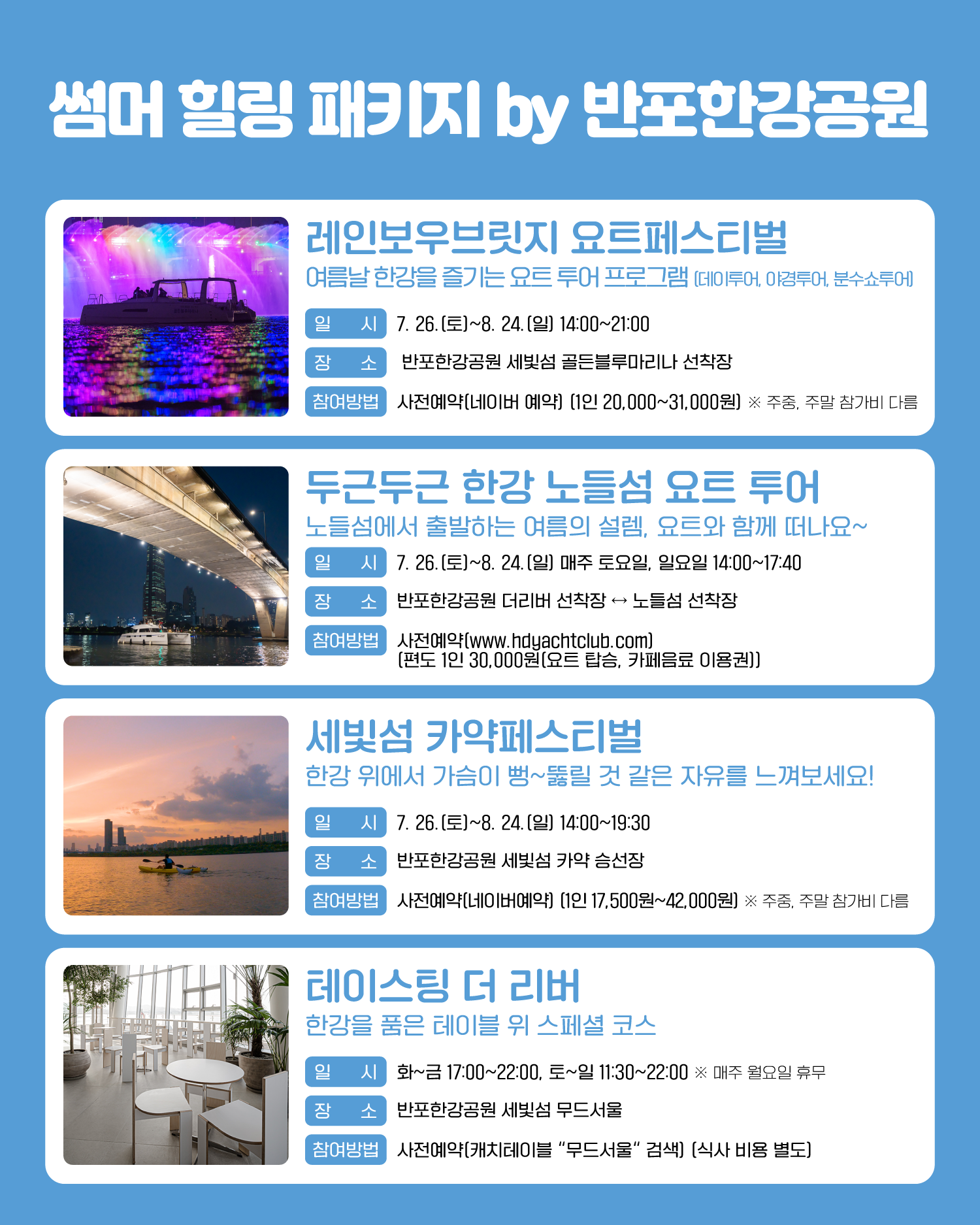 - 🌈 레인보우브릿지 요트페스티벌: 반포 한강공원 상설 운영 (1일 7회)