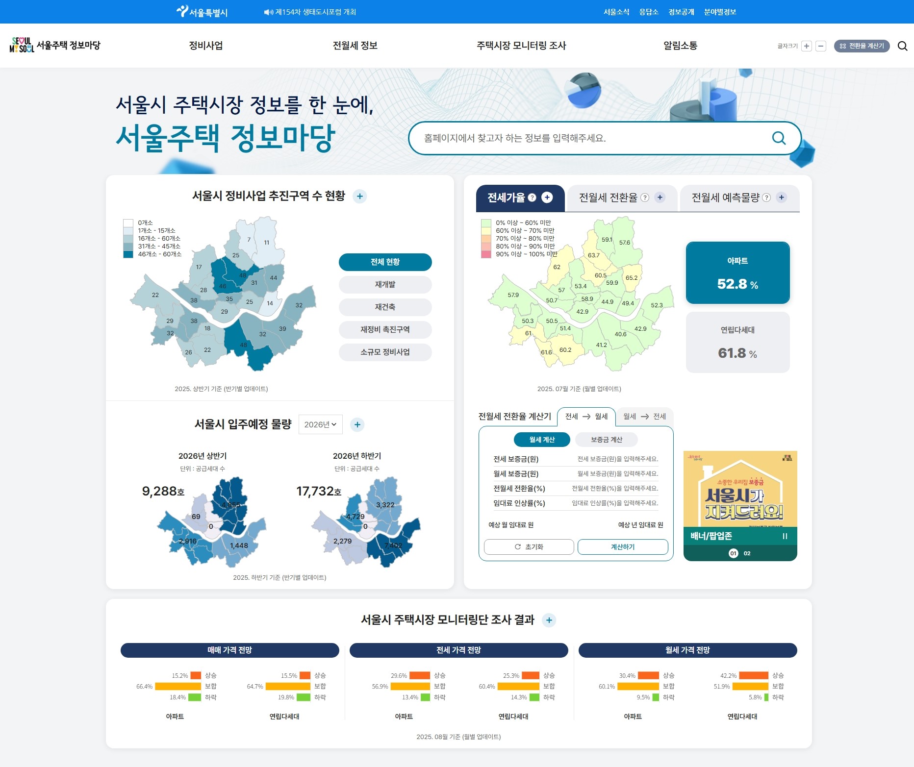 - 기존 서울주거포털의 전월세 정보 + 매매시장 + 정비사업 정보까지 통합 제공