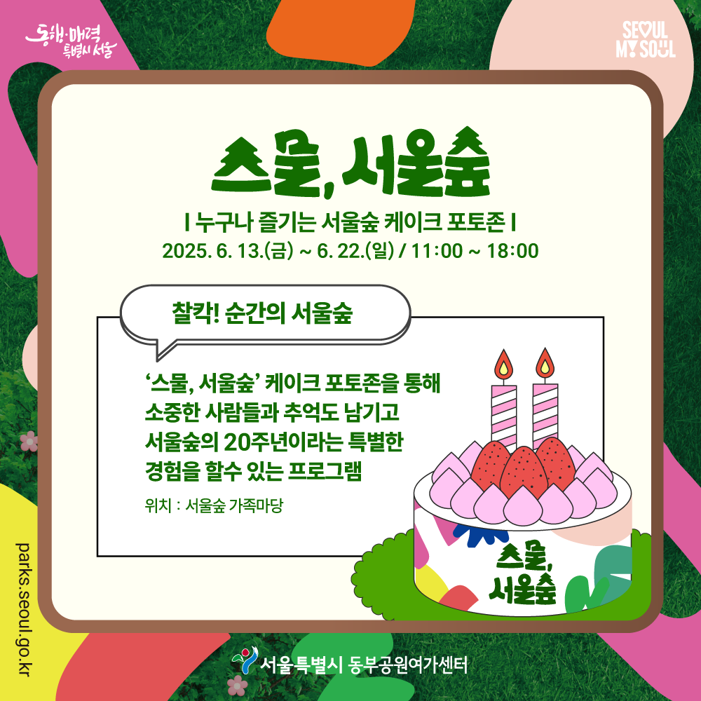 ‘스물, 서울숲’에서 준비한 모든 전시, 체험, 공연은 누구나 무료로 참여할 수 있고, 시민참여 프로그램 중 ‘케이크 화분 만들기’의 경우, 5월 30일 오전 9시부터 서울시 공공서비스 예약 누리집에서 사전예약이 필요하니 참고해 주세요.