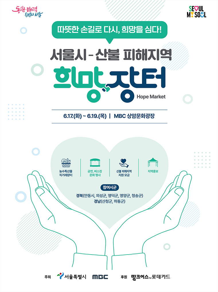 서울시가 산불 피해 지역 농가들을 돕기 위해 6월 17~19일 MBC 상암문화광장에서 ‘산불피해지역 희망장터’를 개최합니다.